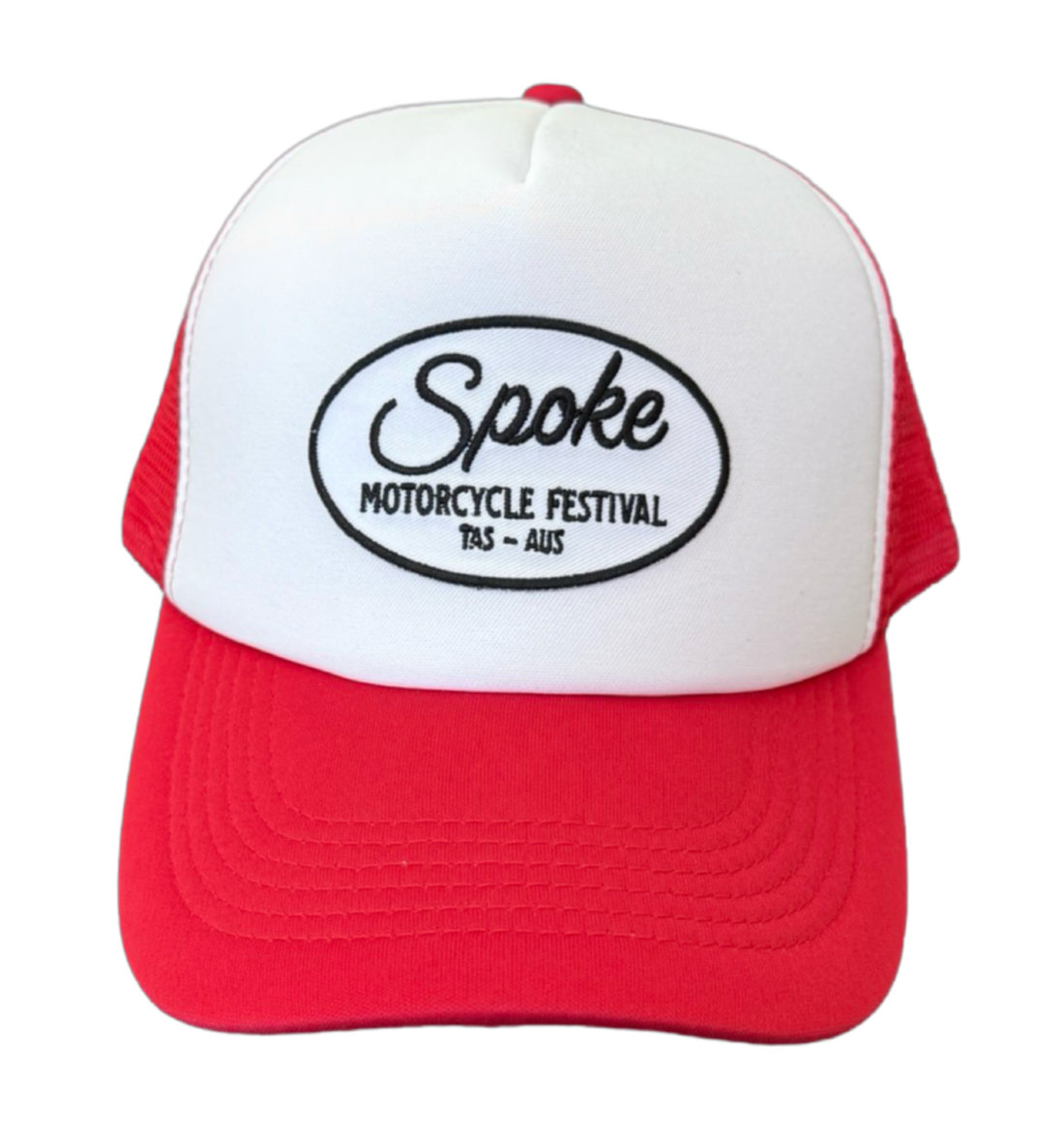 Red Snap Back, Foam Backed, Mesh Truckers Cap with a white 'Spoke Motorcycle Festival' embroidered...