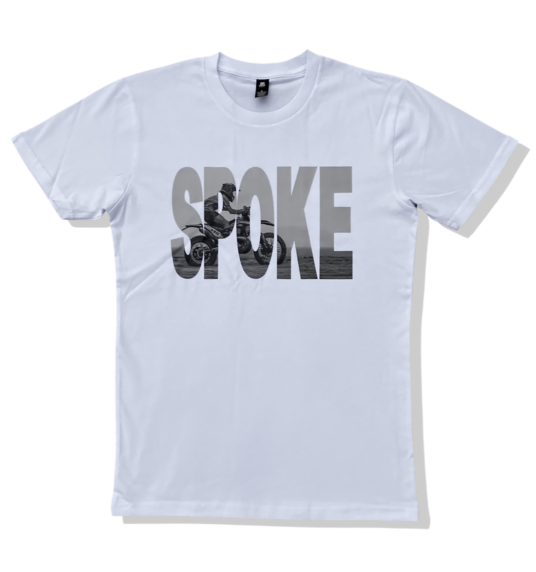 Spoke Motorcycle Festival White T-Shirt - Beach in SPOKE text