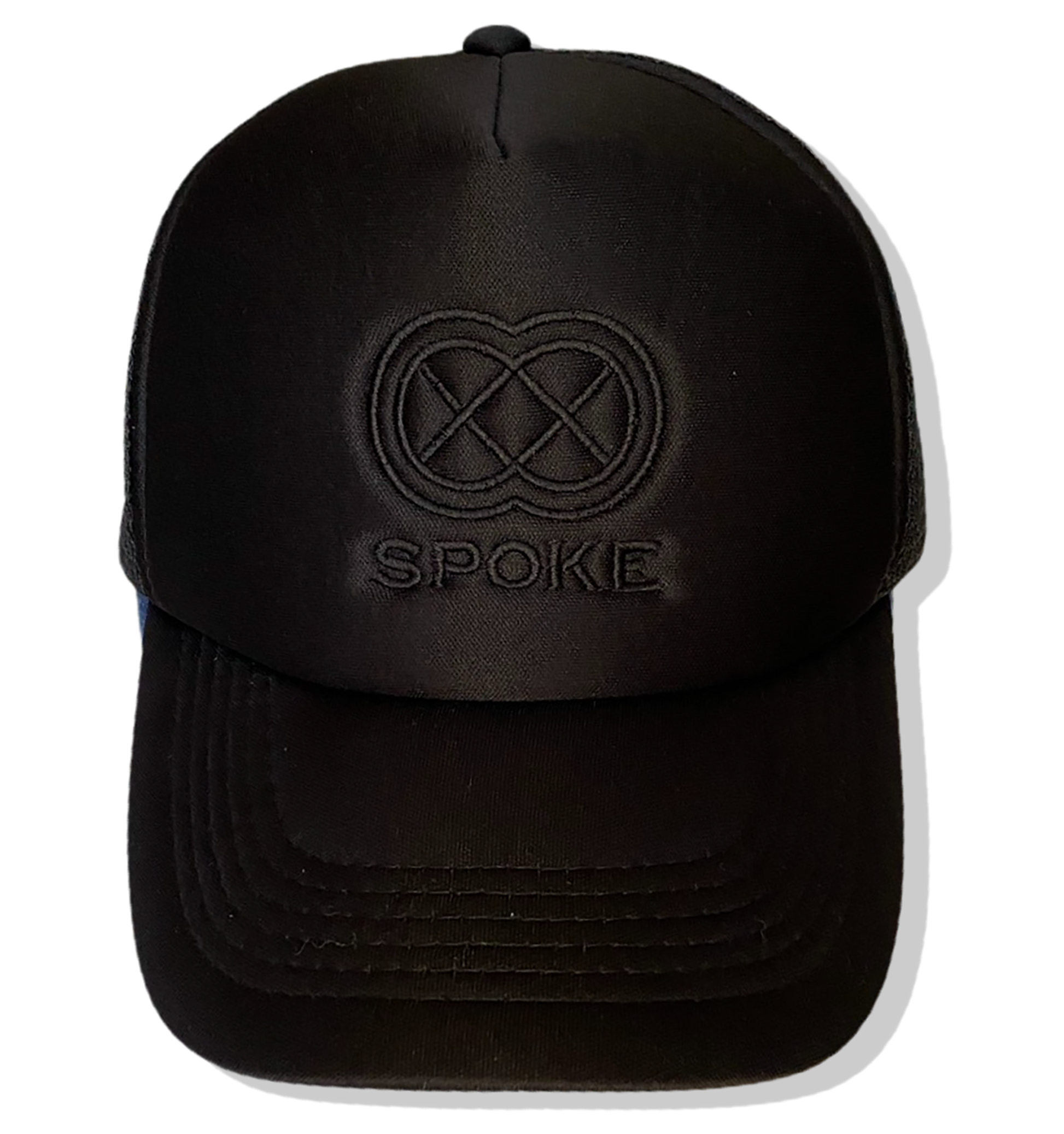 Black Snap Back, Foam Backed, Mesh Truckers Cap with 'SPOKE' and Spoke symbol embroidered on the front.
