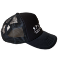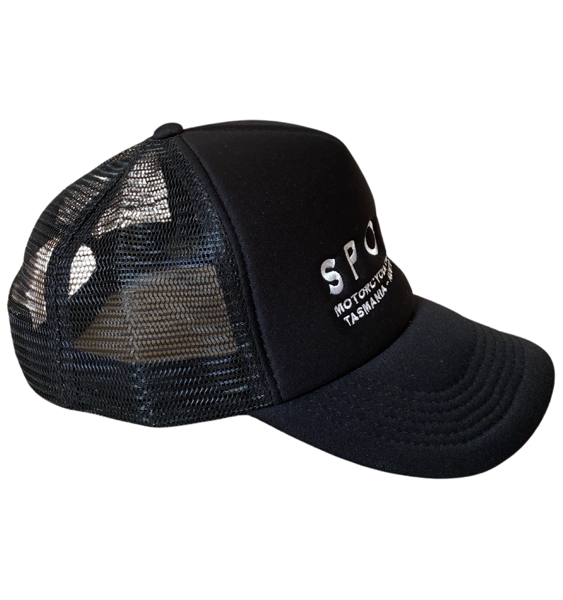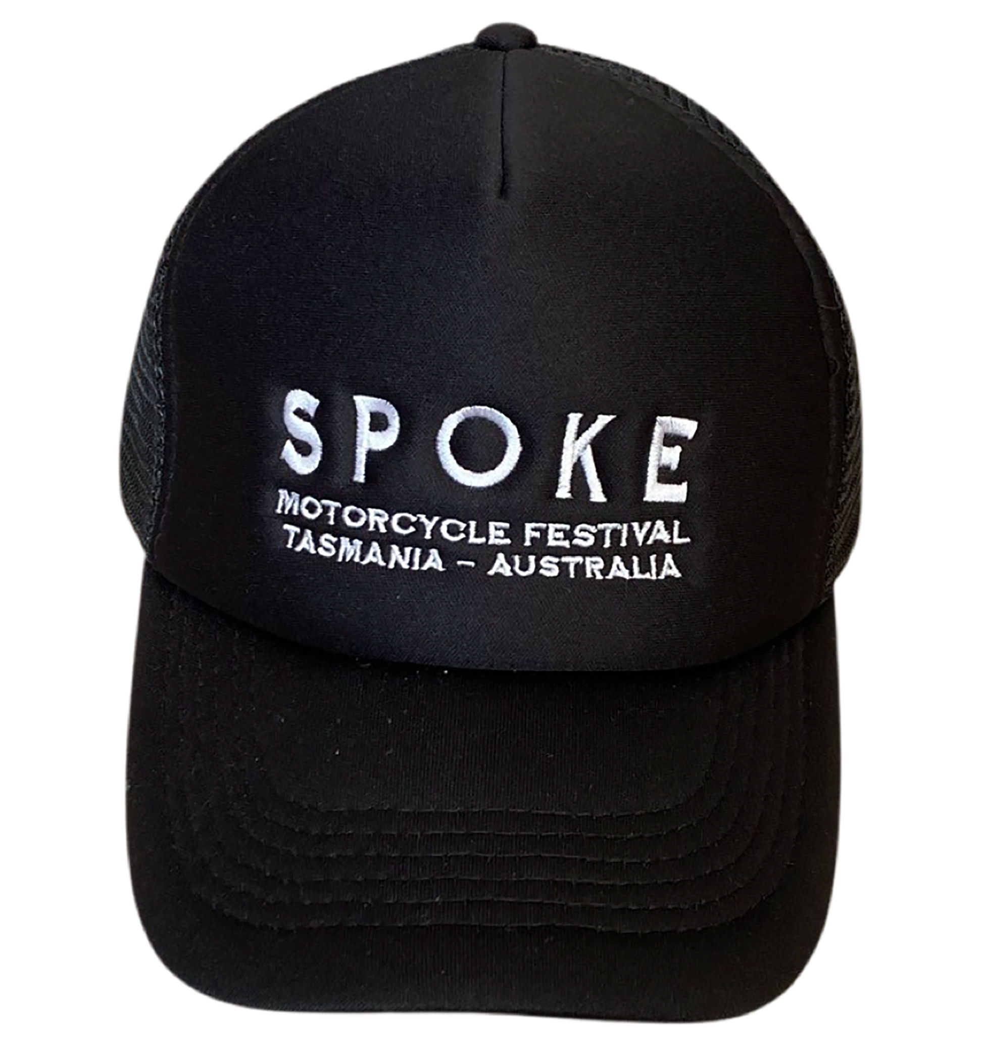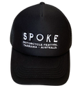 Black Snap Back, Foam Backed, Mesh Truckers Cap with 'SPOKE' and location embroidered on the front.