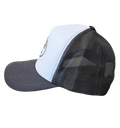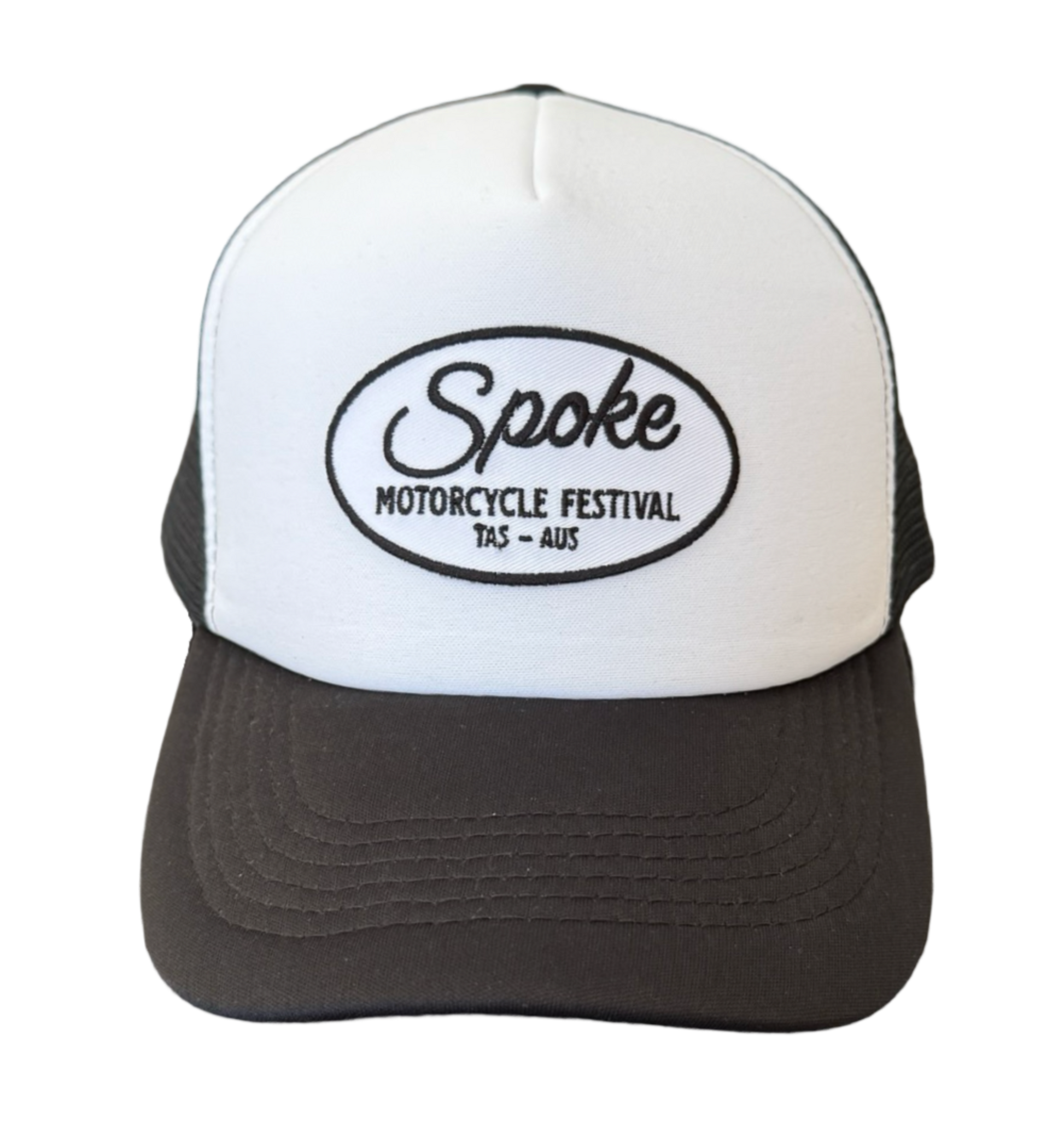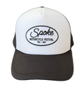 Black Snap Back, Foam Backed, Mesh Truckers Cap with a white 'Spoke Motorcycle Festival' embroidered patch on the front.