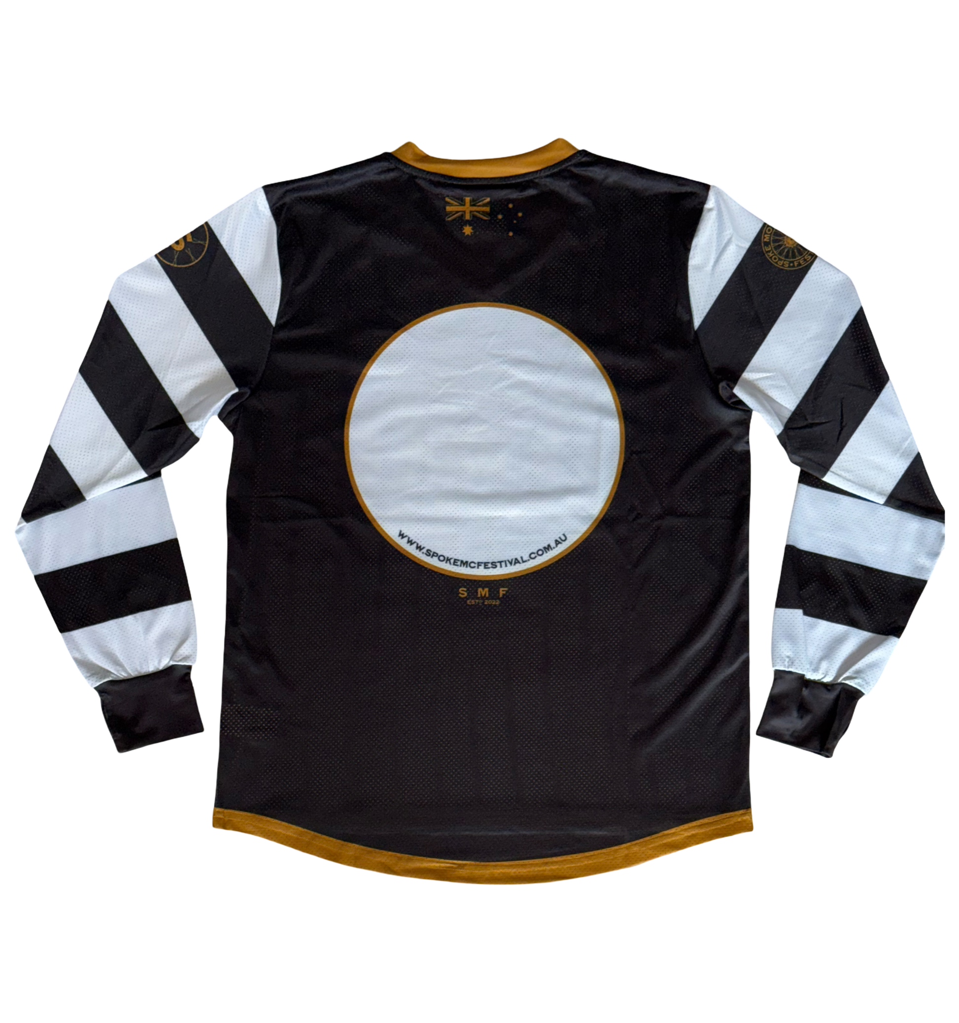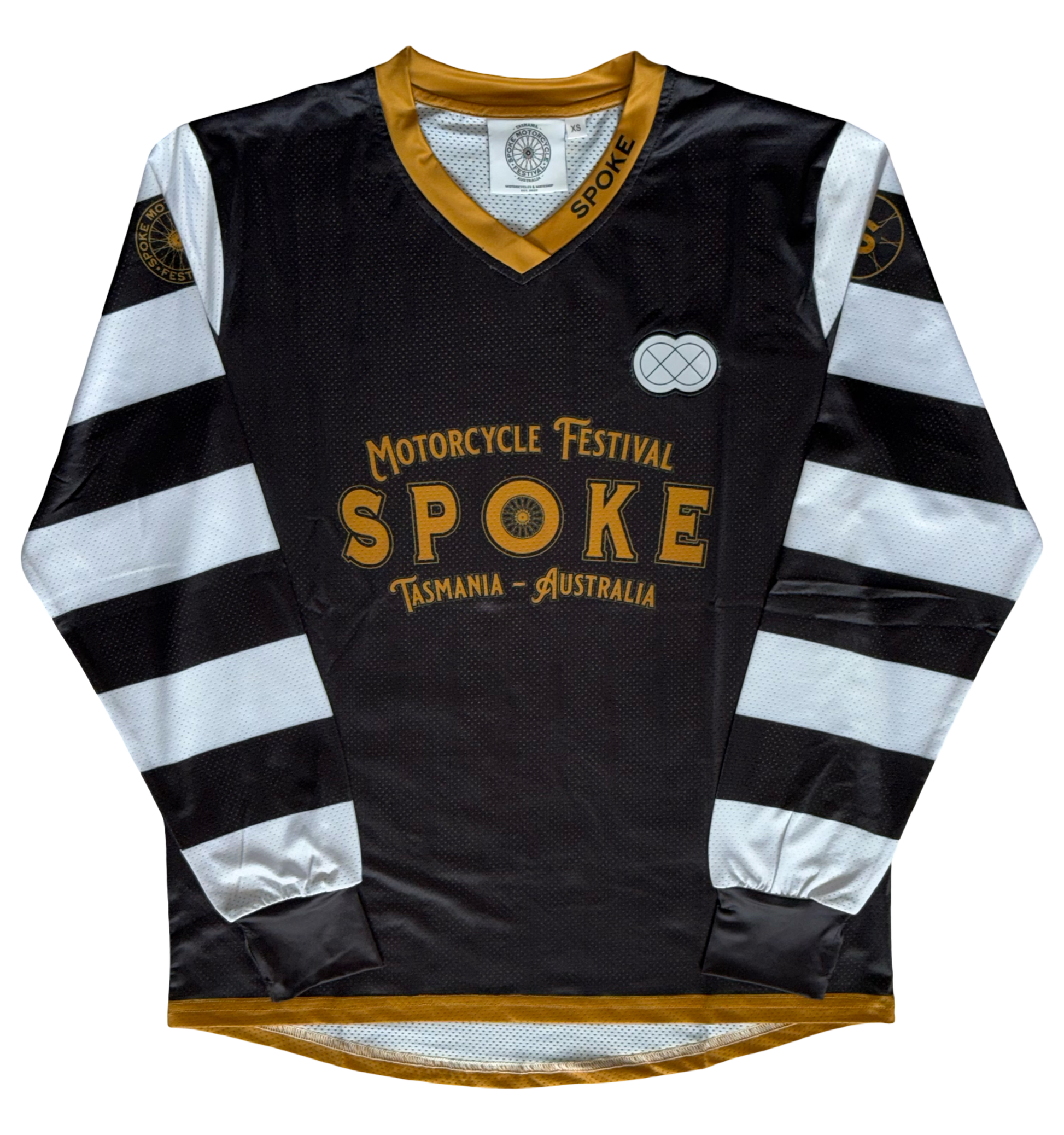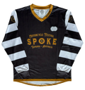 New style scoop back, V neck race jersey complete with thumb holes. Polyester breathable mesh material for great ventilation. Spoke logo on one sleeve and Spoke symbol on the other, with Spoke embroidered symbol on the chest. Number frame on the back.