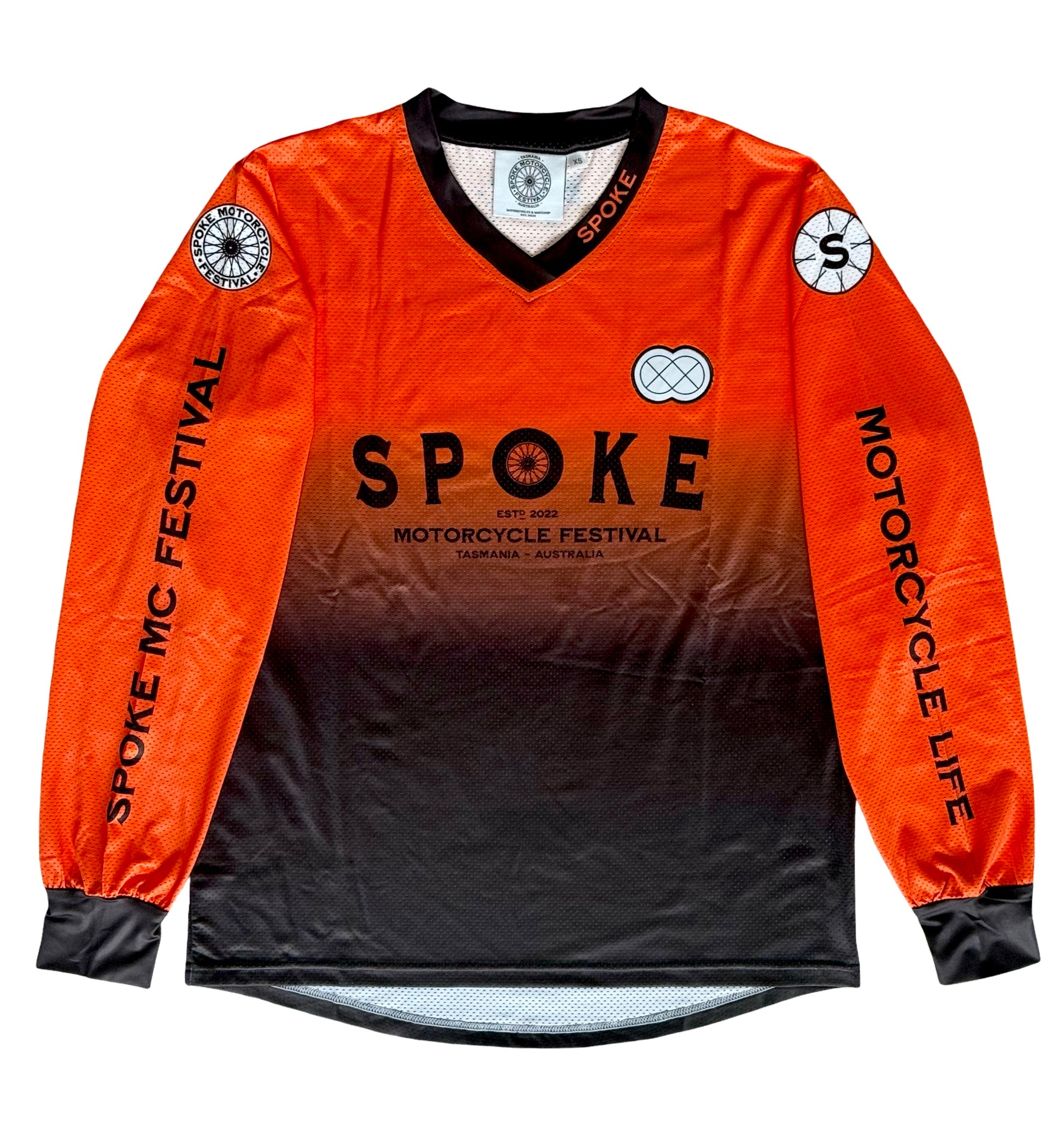 New style scoop back, V neck race jersey complete with thumb holes. Polyester breathable mesh material for great ventilation. Spoke logo on one sleeve and Spoke symbol on the other, with Spoke embroidered symbol on the chest. Number frame on the back.