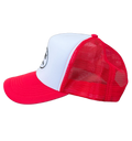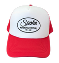 Red Snap Back, Foam Backed, Mesh Truckers Cap with a white 'Spoke Motorcycle Festival' embroidered patch on the front.